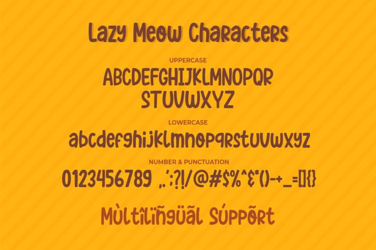 Lazy Meow is a playfull font that will bring happiness and joy. You can choose & combine the uppercase and the lowercase to get perfect combinations. This font is a fun theme very good for, book cover, poster, t-shirt, quote, logotype, craft and etc.